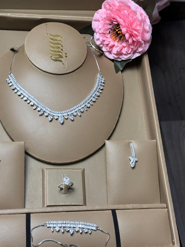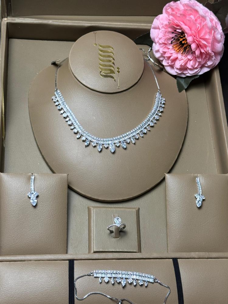 • طقم اكسسوارات فضي ناعم يتميز بتفاصيل فاخرة تضيف سحرًا هادئًا لكل حركة