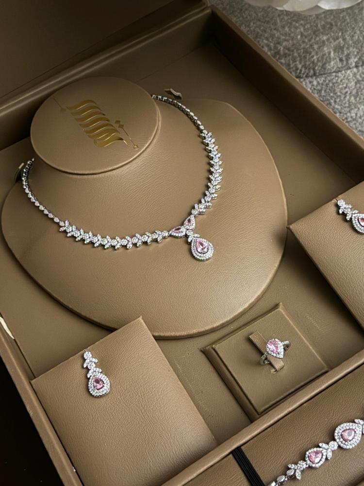 طقم فطقم أنيق يجمع بين نعومة اللون الوردي ورقي الفضي، ليقدّم لك مزيجاً فريداً من الأنوثة والجمال. تفاصيله مصممة بعناية لتناسب كل إطلالة راقية، سواء كانت يومية هادئة أو لمناسبة خاصة تحتاج لمسة تميز. الفضي يعكس البساطة والفخامة، بينما يضيف الوردي لمسة دافئة وناعمة تمنحك طابعاً أنثوياً ساحراً. طقم مثالي لمن تبحث عن التوازن بين الأناقة والرقة، ولمن تهتم بالتفاصيل التي تصنع الفرق.ضي بتفاصيل ناعمة يلتقي بلمسة زيتي فاخرة.. مزيج يضفي لمسة من الأناقة الكلاسيكية على كل إطلالة.
