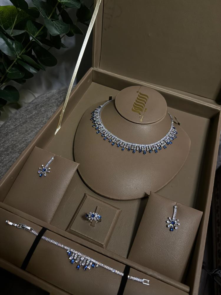 سحر التفاصيل يلتقي بأناقة الألوان… طقم فضي بتصميم ناعم يزدان بلمسات من الأزرق الهادئ ليمنحك إشراقة ملكية تنبض بالتميّز والرقي.